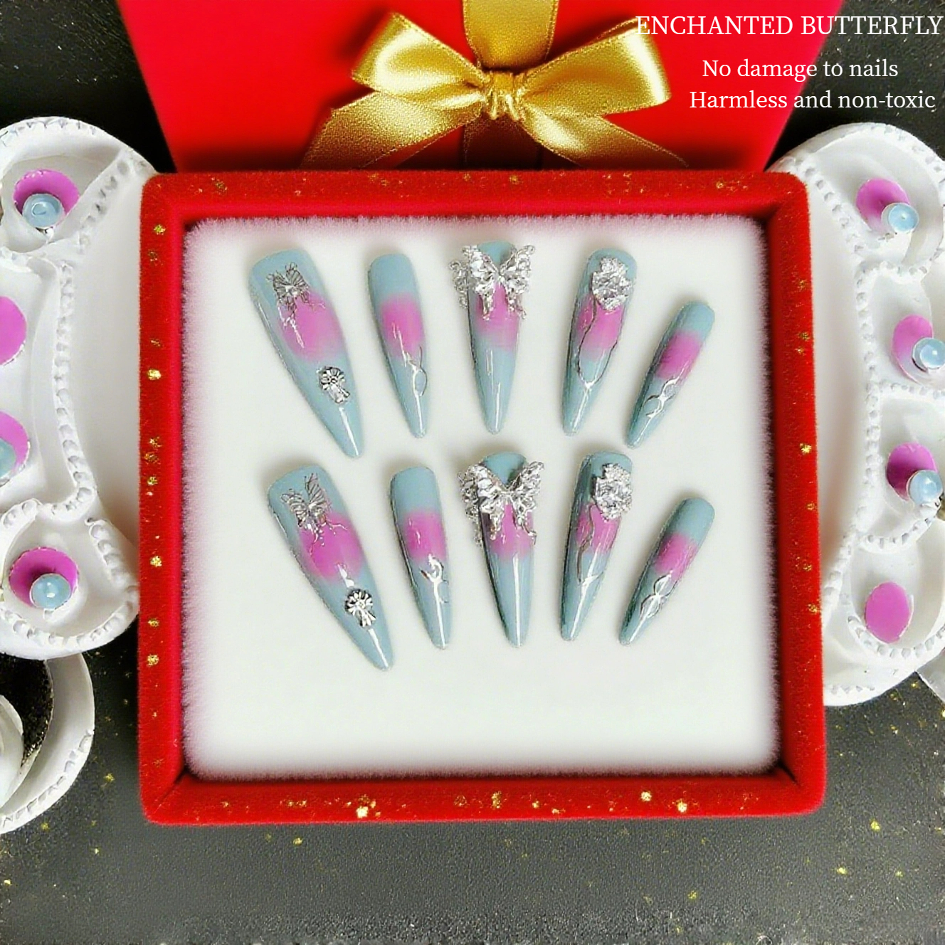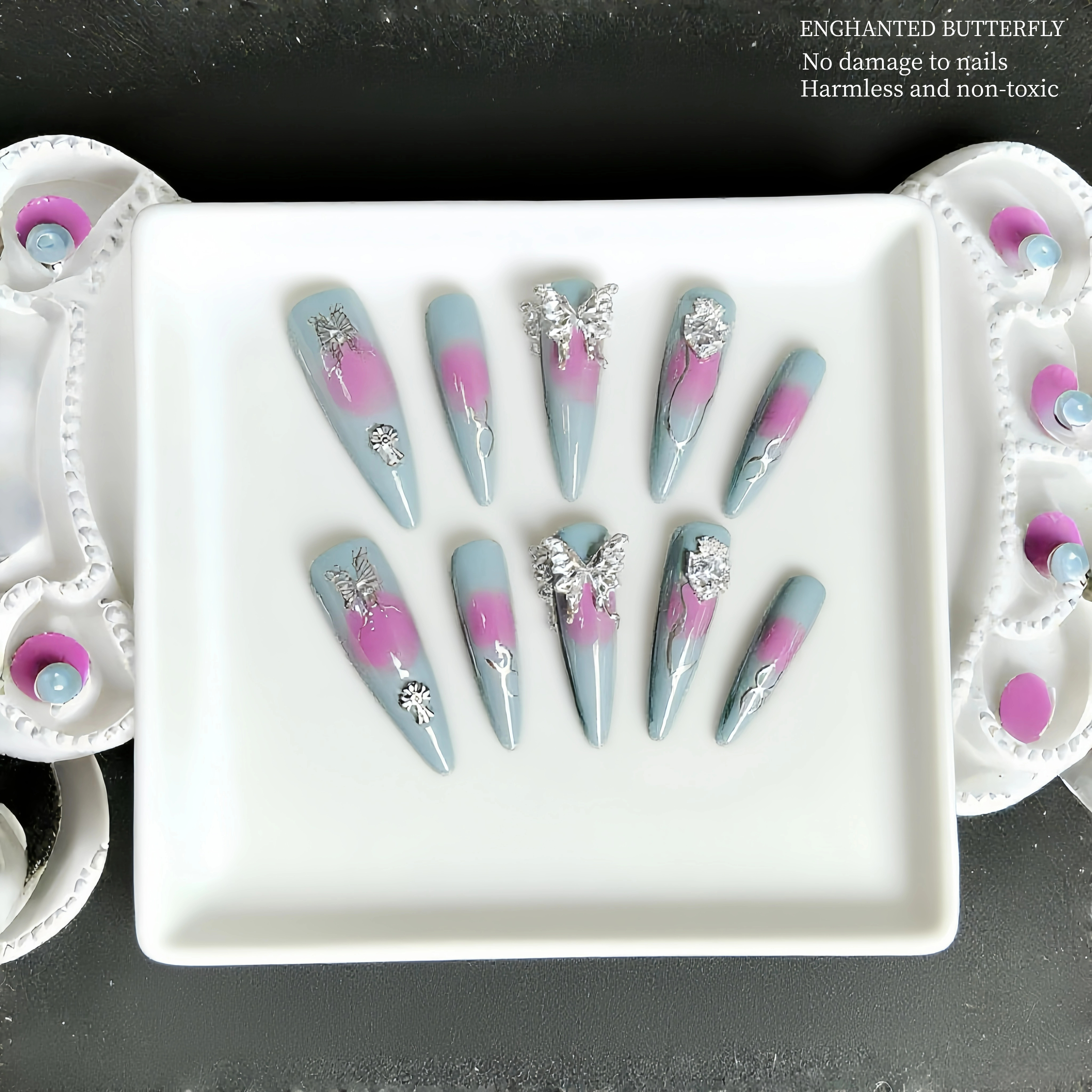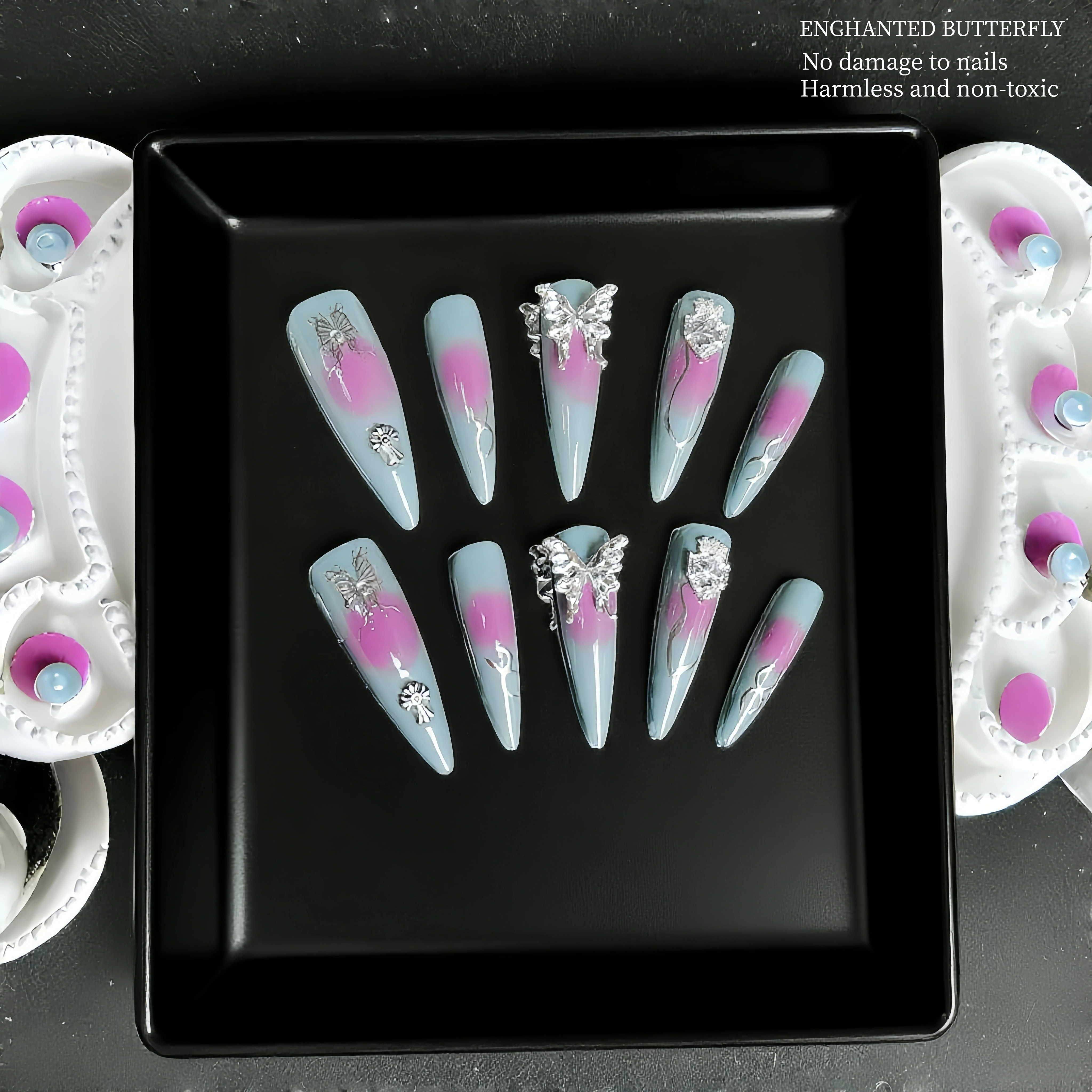 These nails are a mesmerizing blend of soft hues and elegant embellishments. The gentle gradient of light blue and pink creates a soothing, ethereal effect. Delicate silver butterflies and other charming accents add a touch of magic and sophistication. Whether you're attending a special event or just want to feel a bit more glamorous in your daily life, these nails are sure to make a statement, showcasing a perfect balance of subtlety and sparkle.
