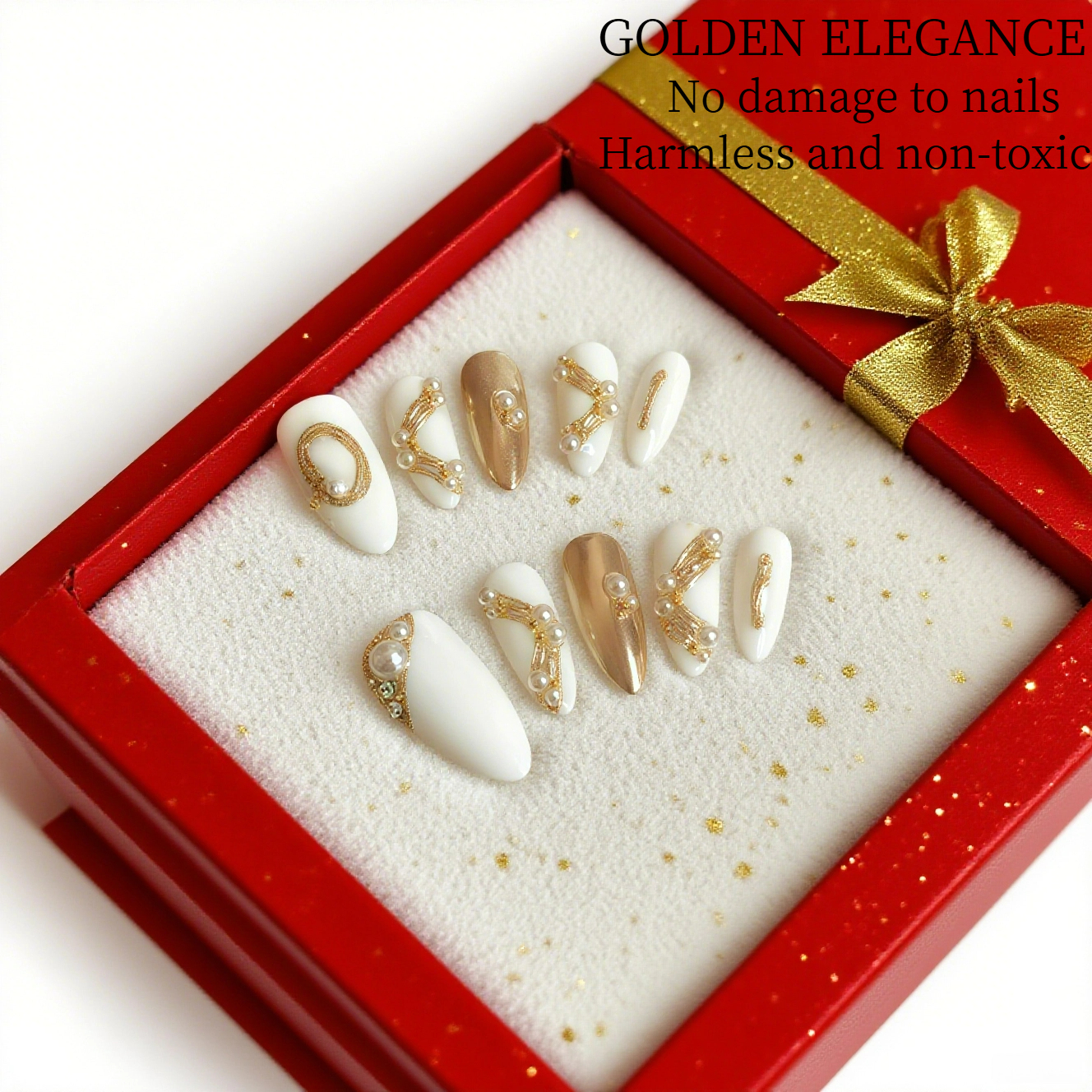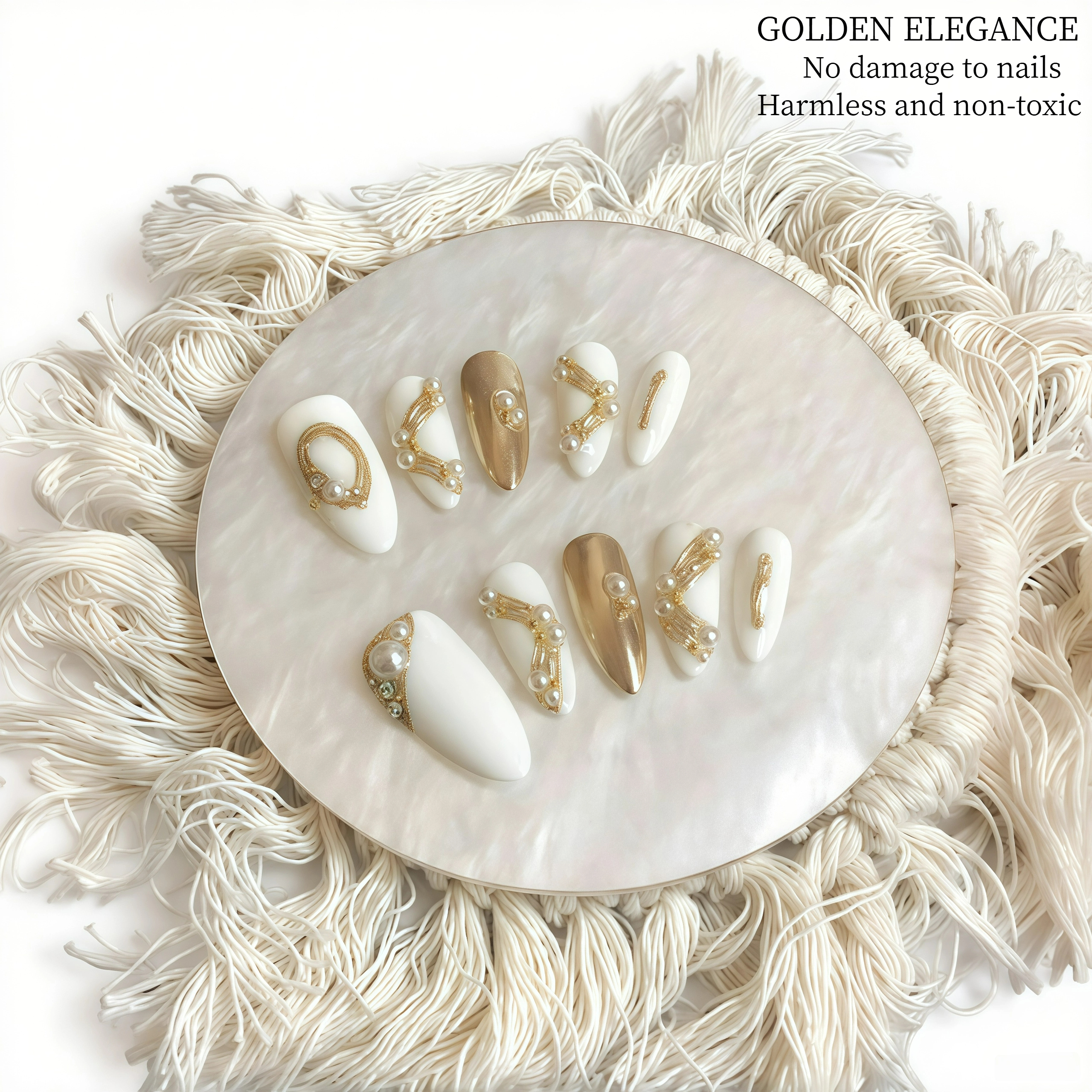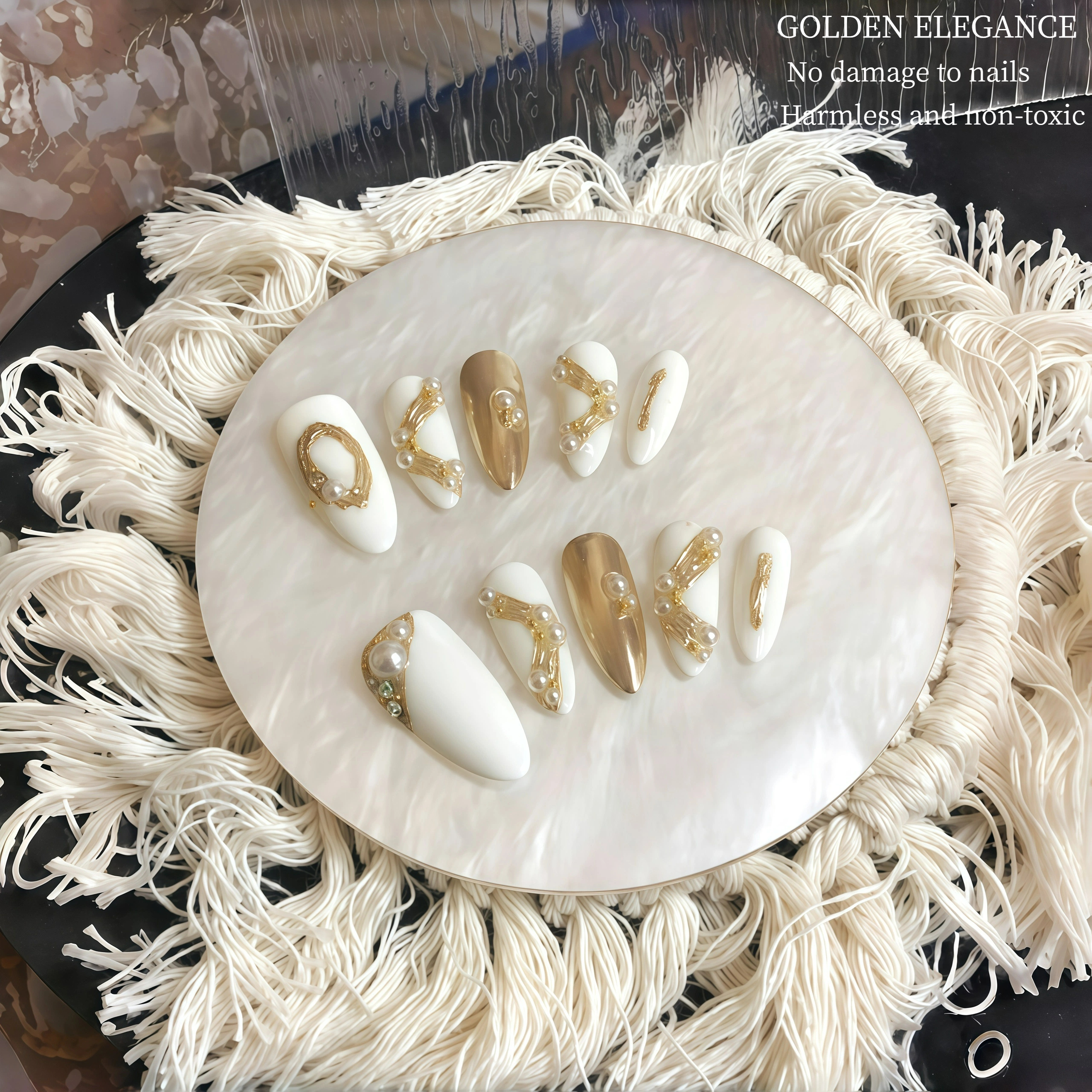 This set of nails features an elegant combination of white and gold.