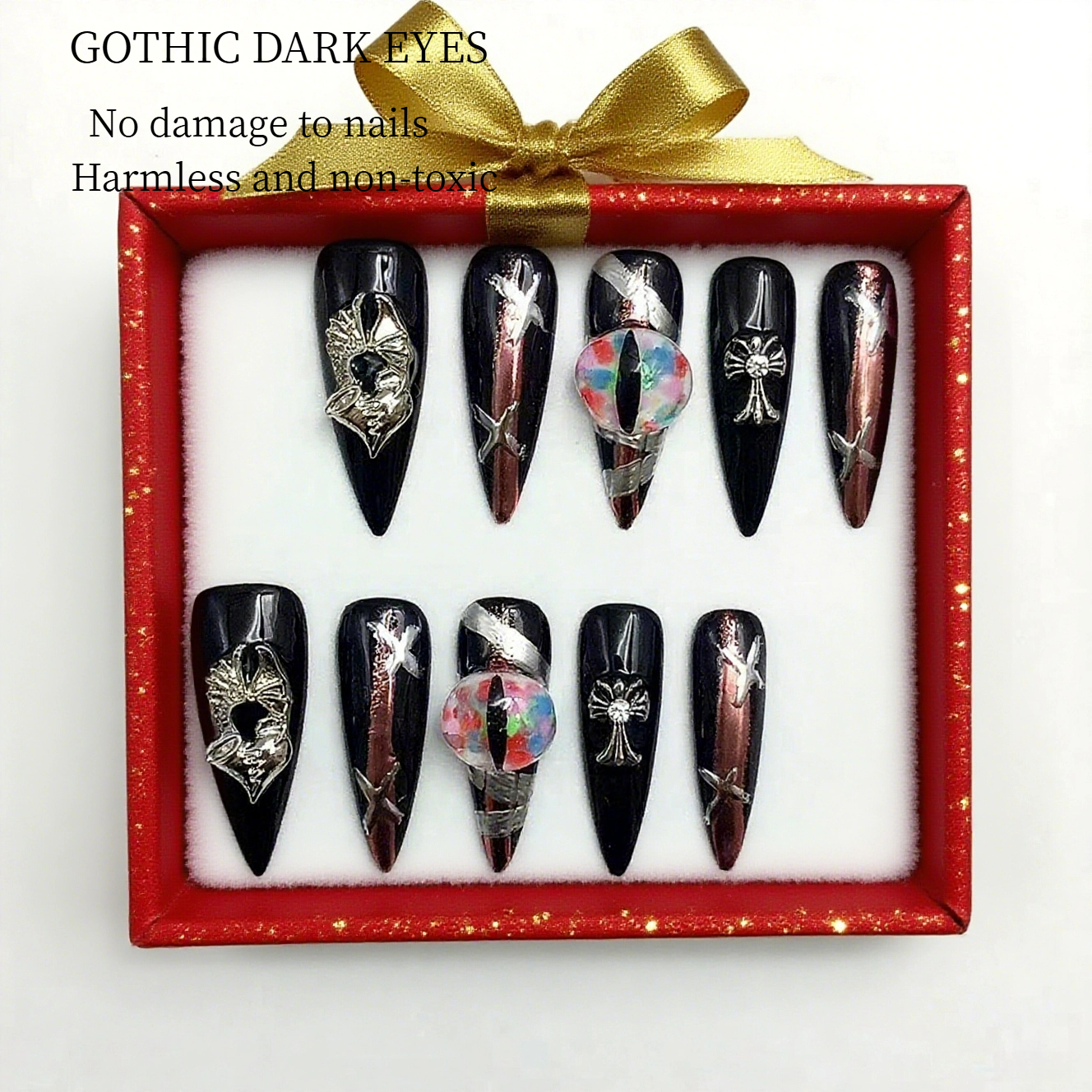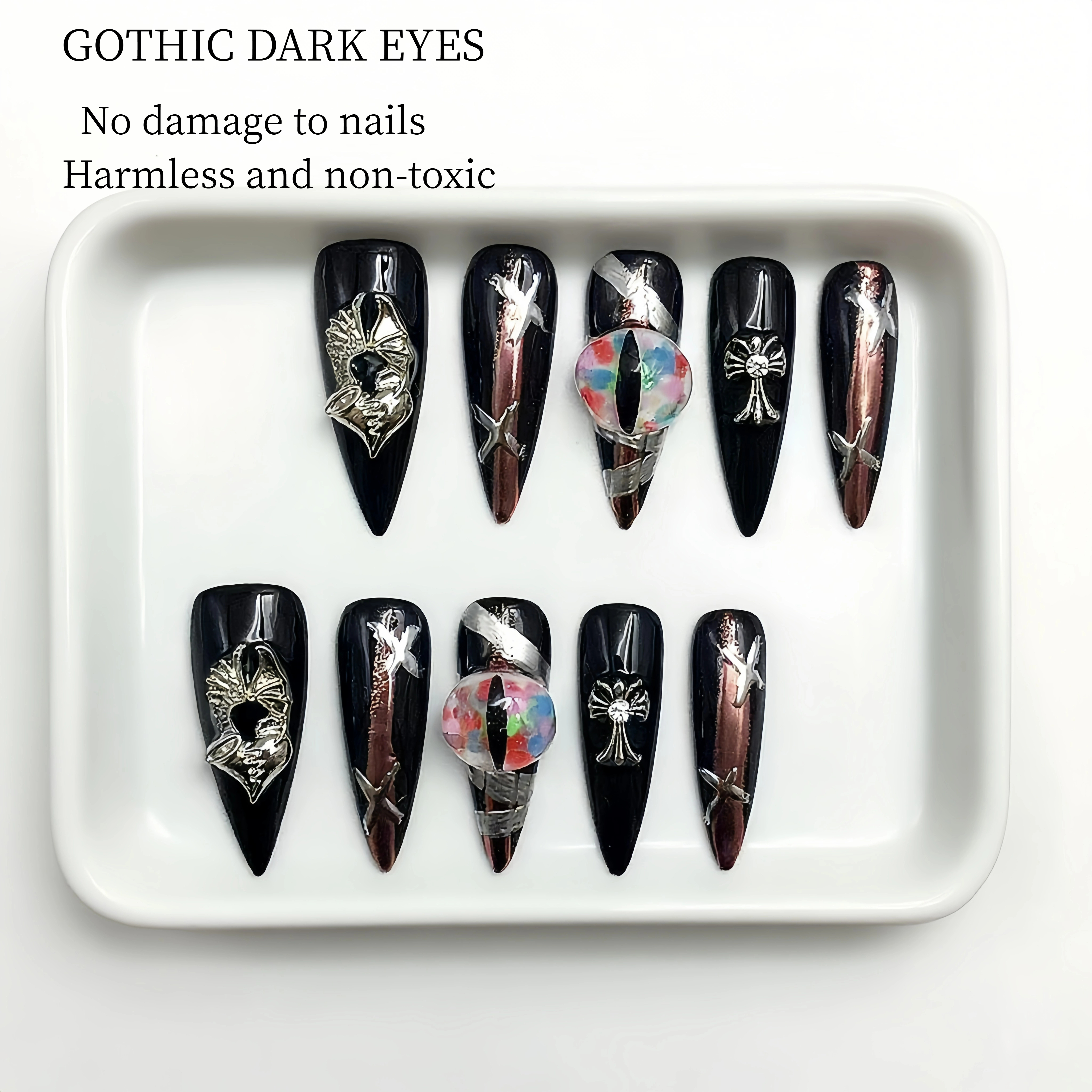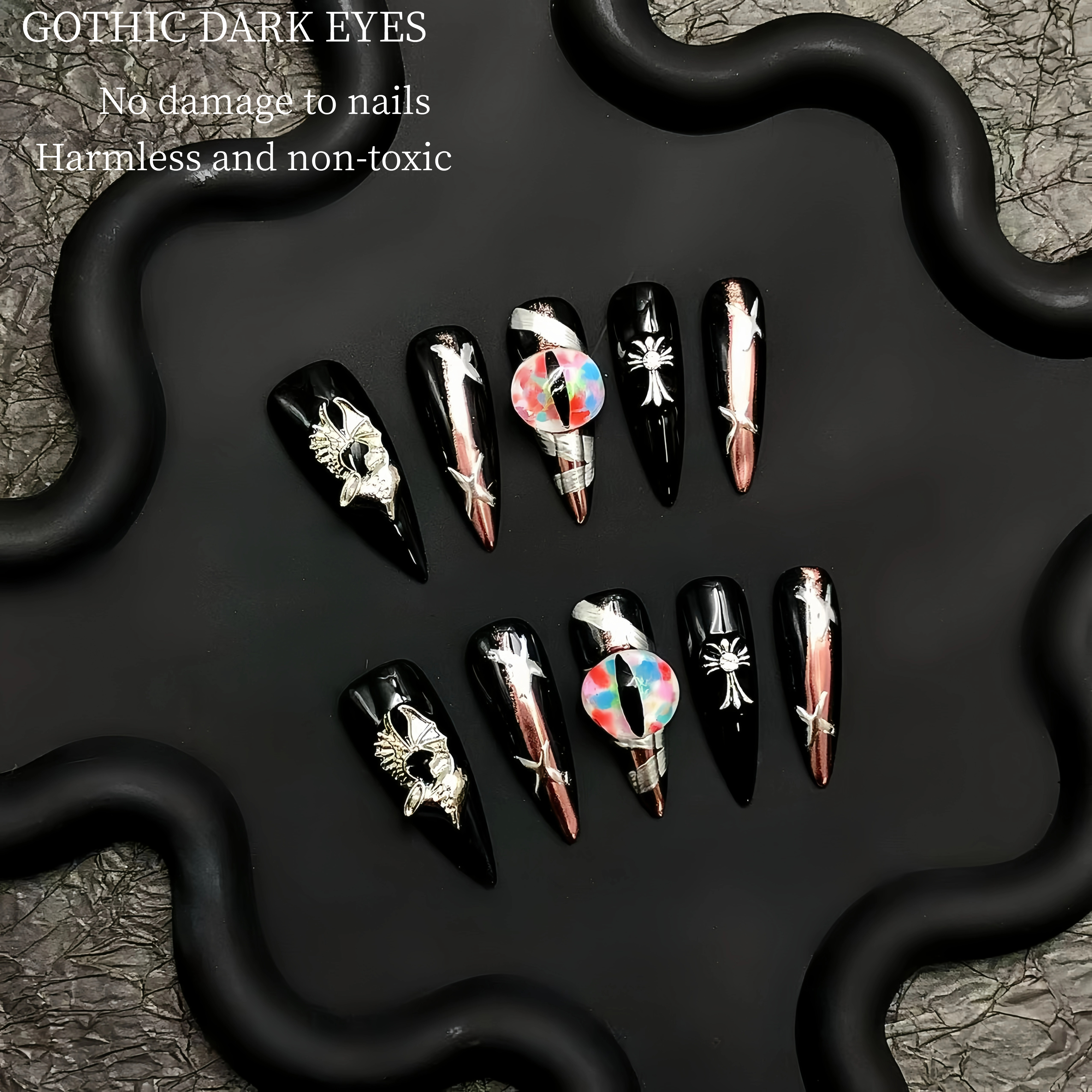 These nails are a perfect blend of elegance and edginess. The sleek black base provides a bold and sophisticated backdrop, while the intricate metallic and iridescent accents add a touch of glamour and uniqueness. Each nail is meticulously designed, making them perfect for those who want to make a bold fashion statement. Whether for a night out or a special event, these nails are sure to turn heads and showcase your impeccable taste in nail art.
