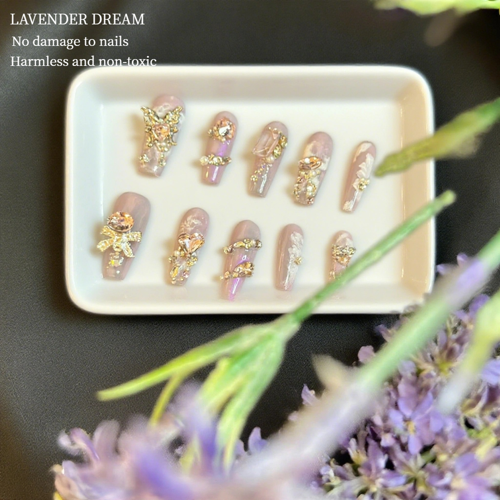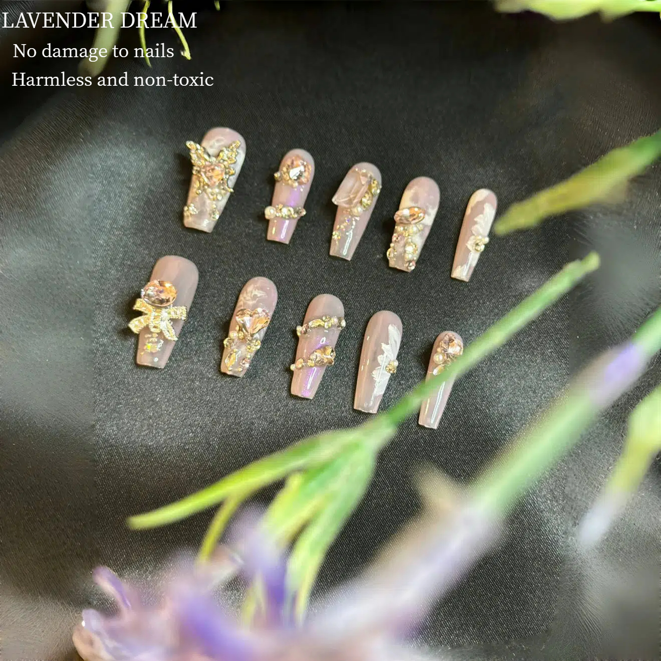 These nails are a true masterpiece of elegance and charm. The soft lavender hue creates a gentle and sophisticated backdrop, while the sparkling gems and delicate pearls add a touch of luxury and glamour. Each nail is a work of art, with intricate designs that catch the light and draw the eye. Whether you're attending a formal event or just want to feel a bit more special in your daily life, these nails are sure to make a statement and leave a lasting impression.