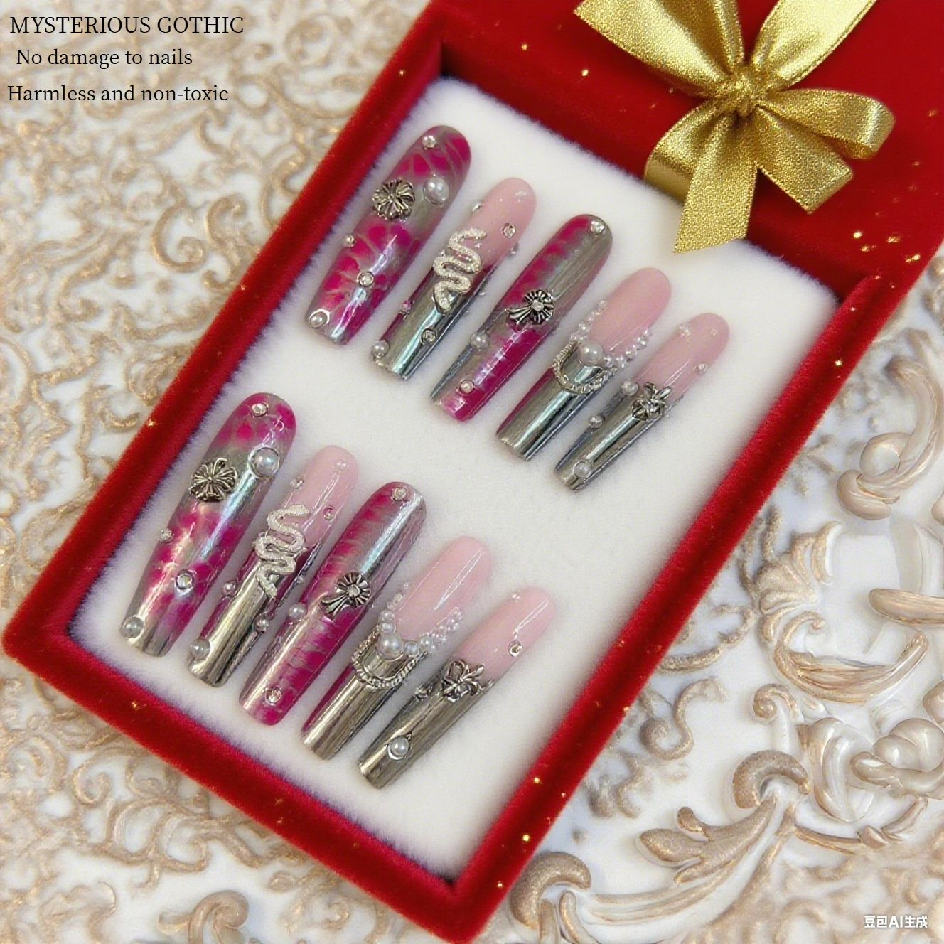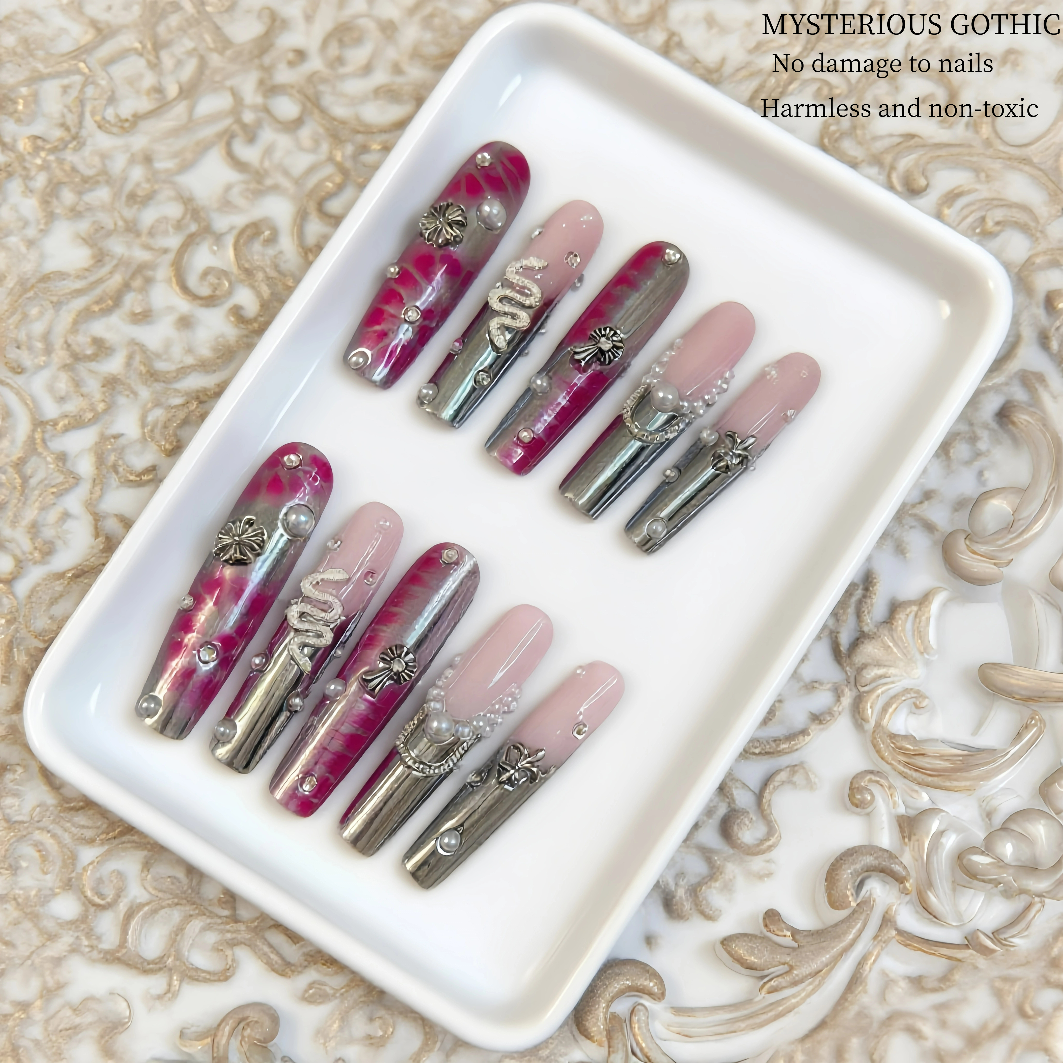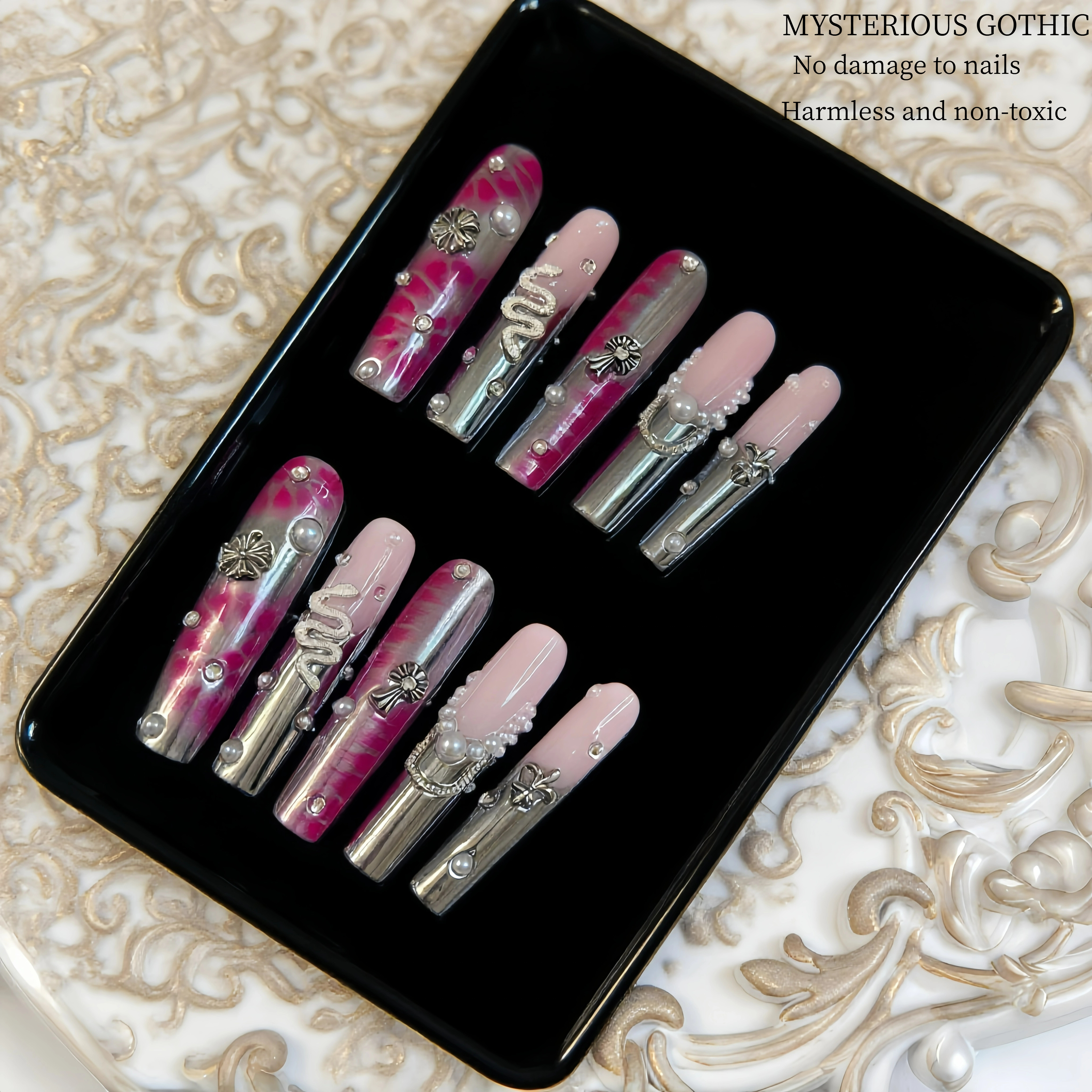 These nails are a striking blend of edginess and elegance. The combination of pink hues with metallic accents creates a visually captivating contrast. Ornaments like crosses, pearls, and unique patterns add a touch of mystery and sophistication. Whether you're aiming for a bold fashion statement or want to embrace a bit of gothic - inspired charm, these nails are sure to stand out, making your hands the center of attention.