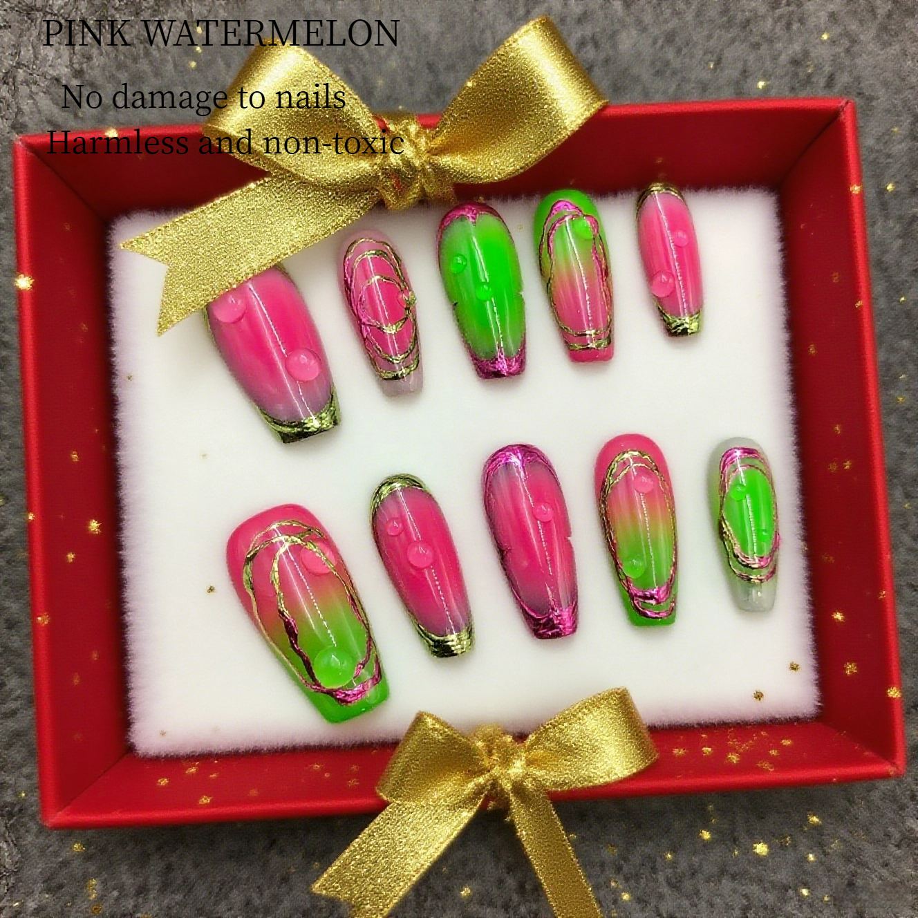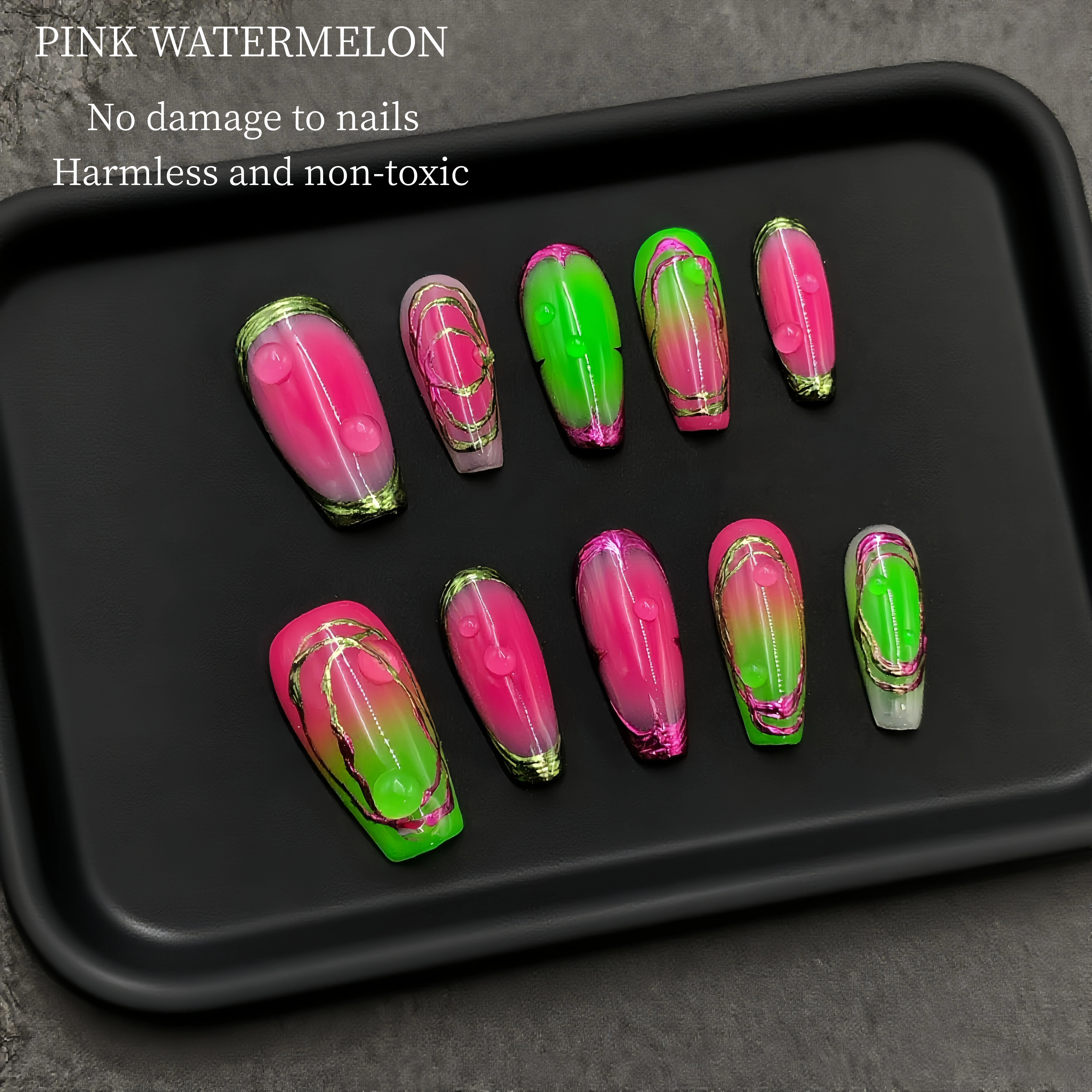 DetailThese nails are a striking blend of boldness and elegance. The vibrant neon gradient, transitioning between pink and green, creates a visually stimulating effect. The delicate gold lines add a touch of sophistication, making the overall design both eye - catching and refined. Perfect for those who want to make a statement, these nails are sure to turn heads and showcase a unique sense of style. Whether for a night out or a special event, they are bound to add a pop of color and glamour to any look.