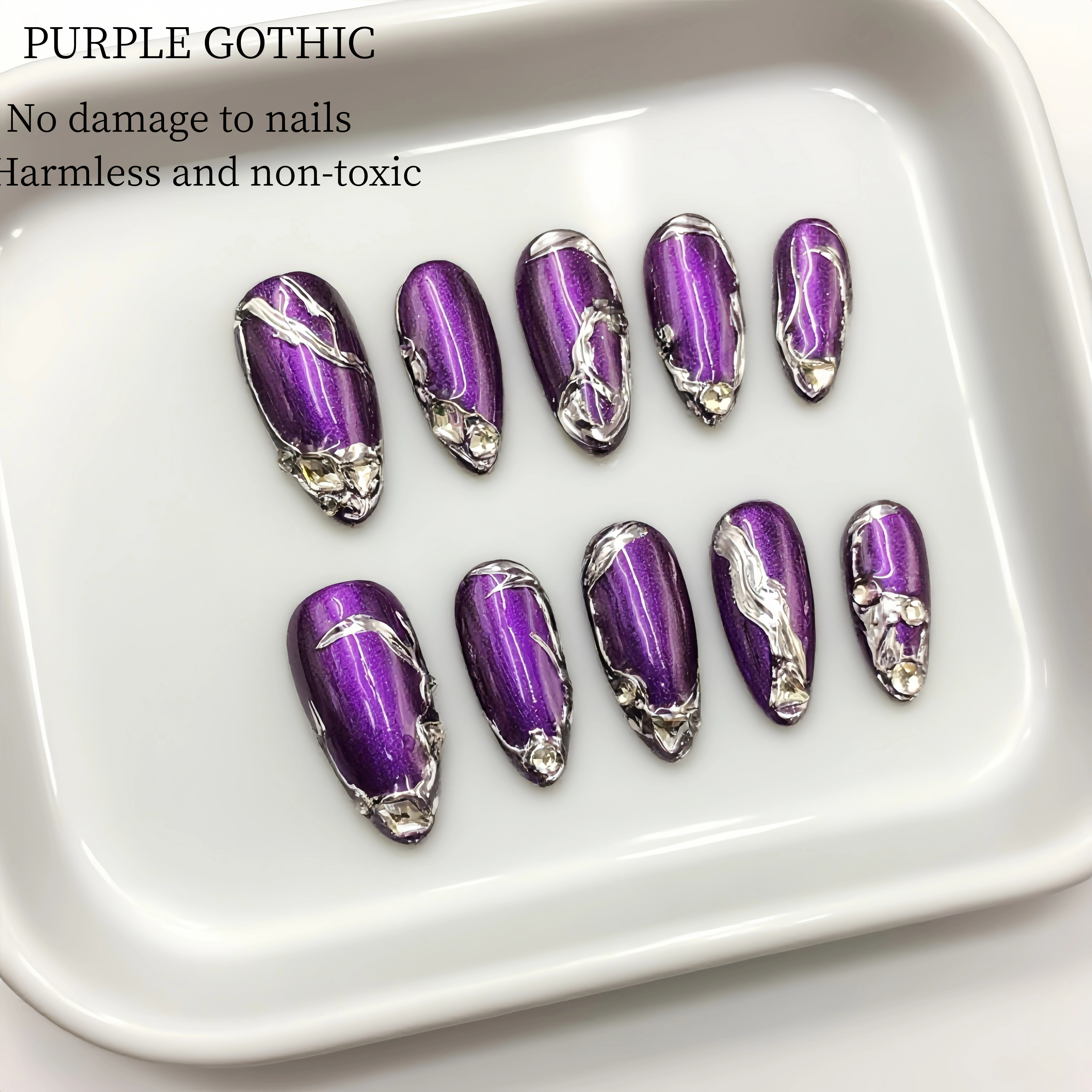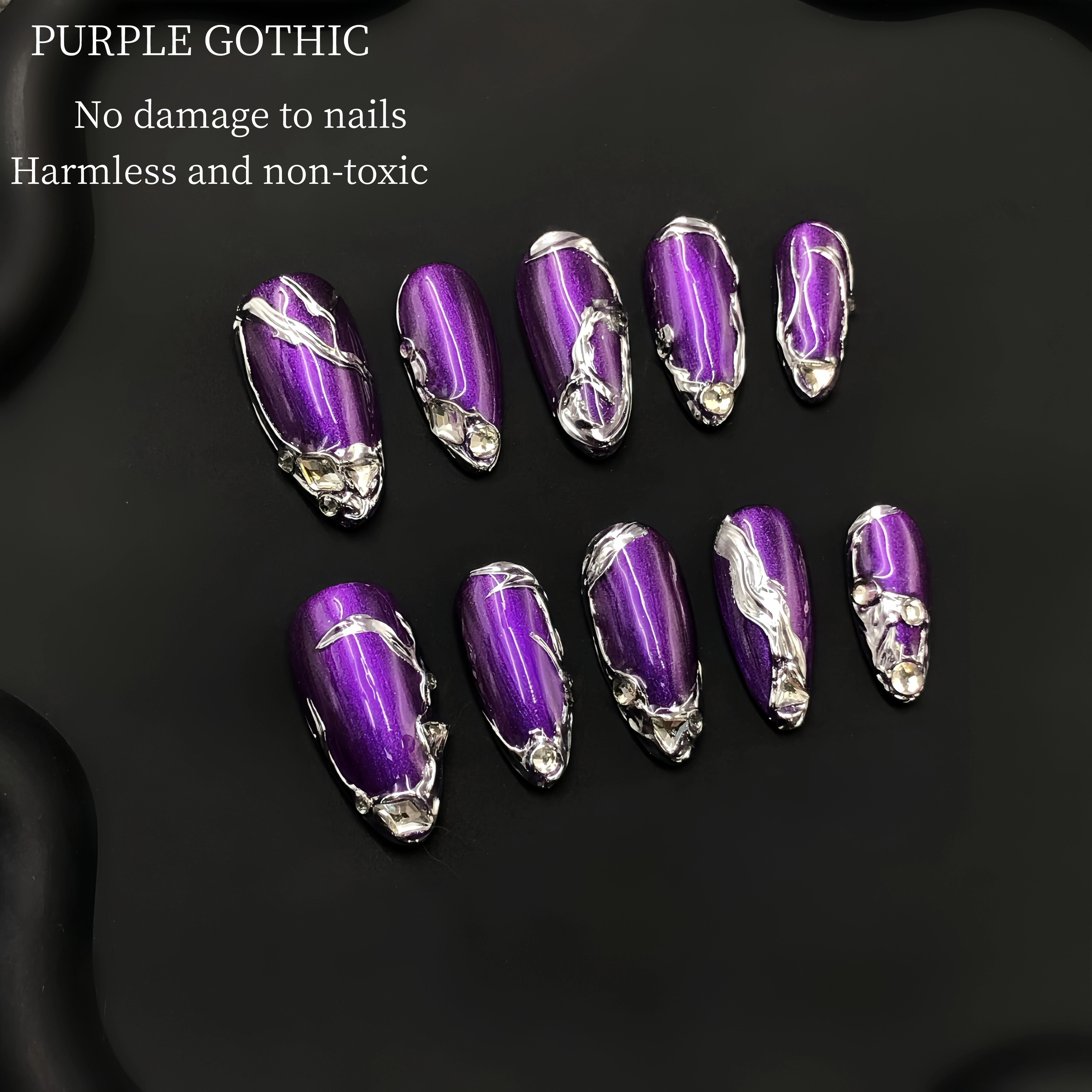 These nails are a perfect blend of edgy and elegant. The deep purple base provides a rich and mysterious backdrop, while the silver chrome accents add a touch of futuristic glamour. The intricate designs, with their bold lines and unique patterns, create a look that's both sophisticated and avant - garde. Whether you're attending a party or simply want to make a bold fashion statement, these nails are sure to turn heads and showcase your unique sense of style.