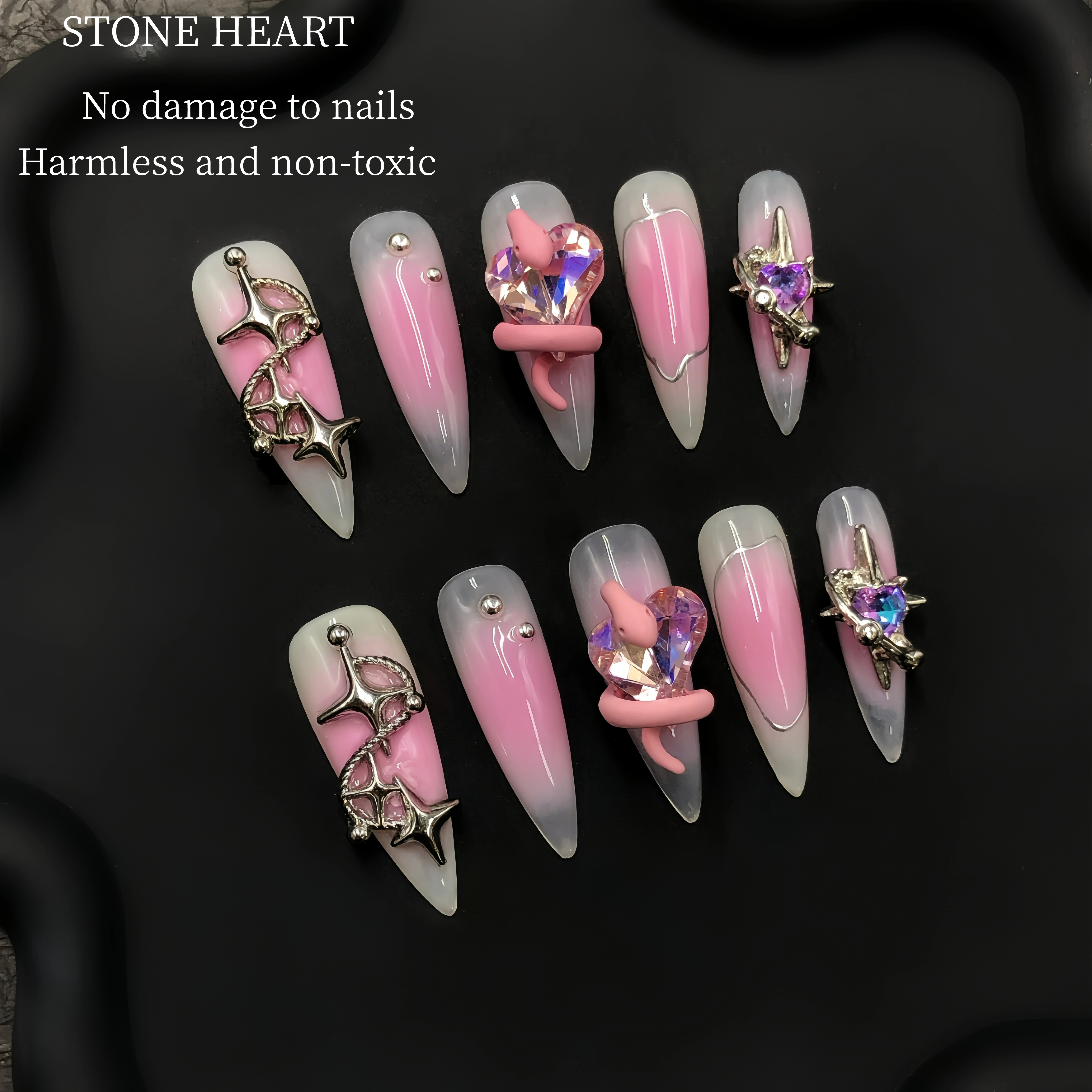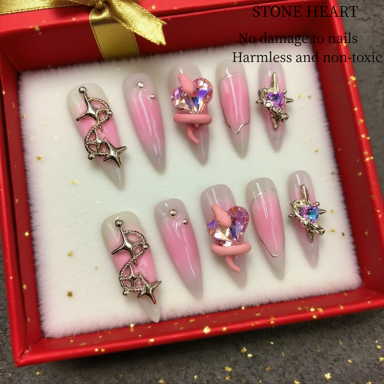 These nails are a captivating display of elegance and luxury. The smooth pink gradient creates a soft and feminine backdrop, while the dazzling crystal heart - shaped embellishments and intricate metal decorations add a touch of opulence. Each nail is meticulously adorned, making them perfect for special occasions. Whether it's a high - end party or a romantic event, these nails are sure to draw attention and showcase your refined sense of fashion.