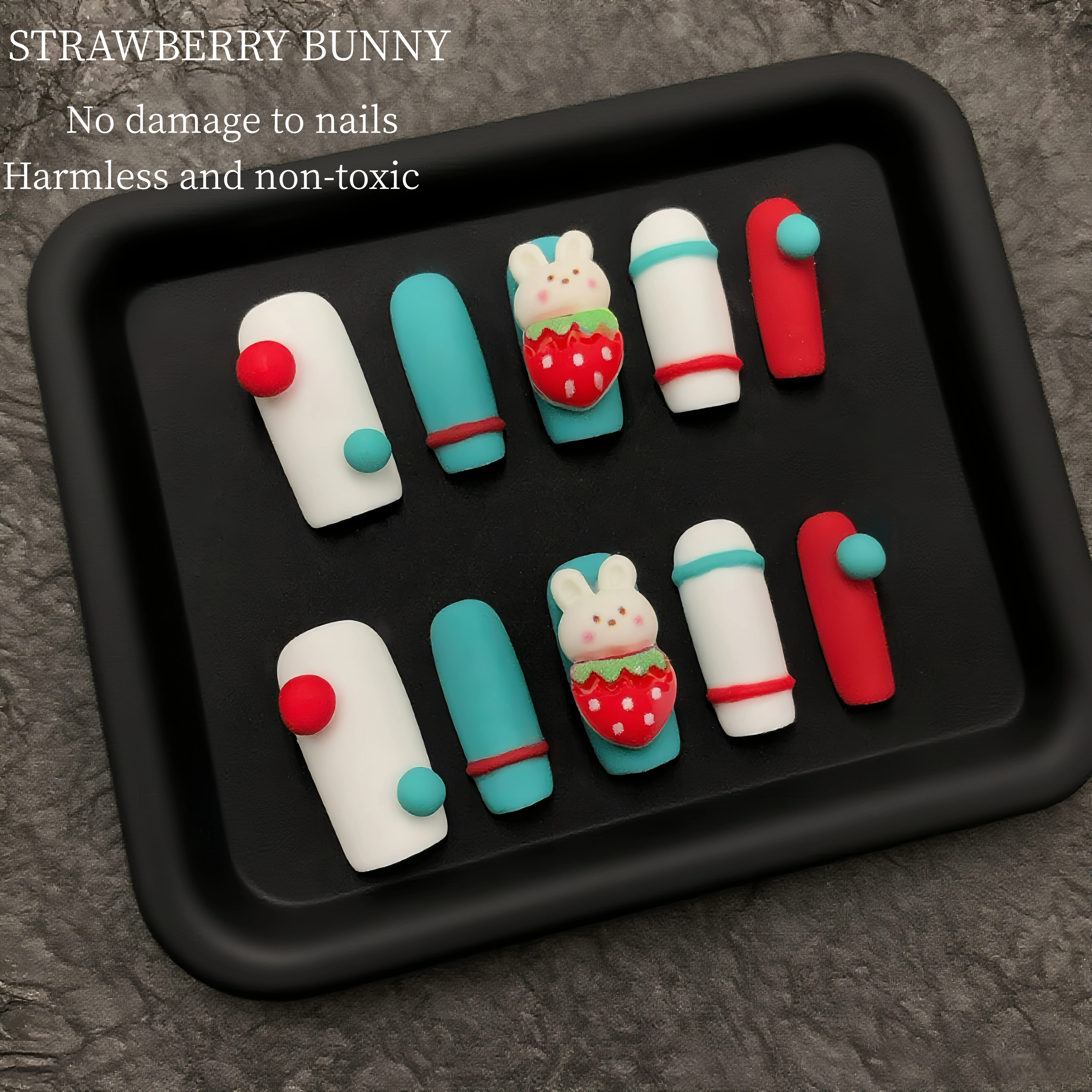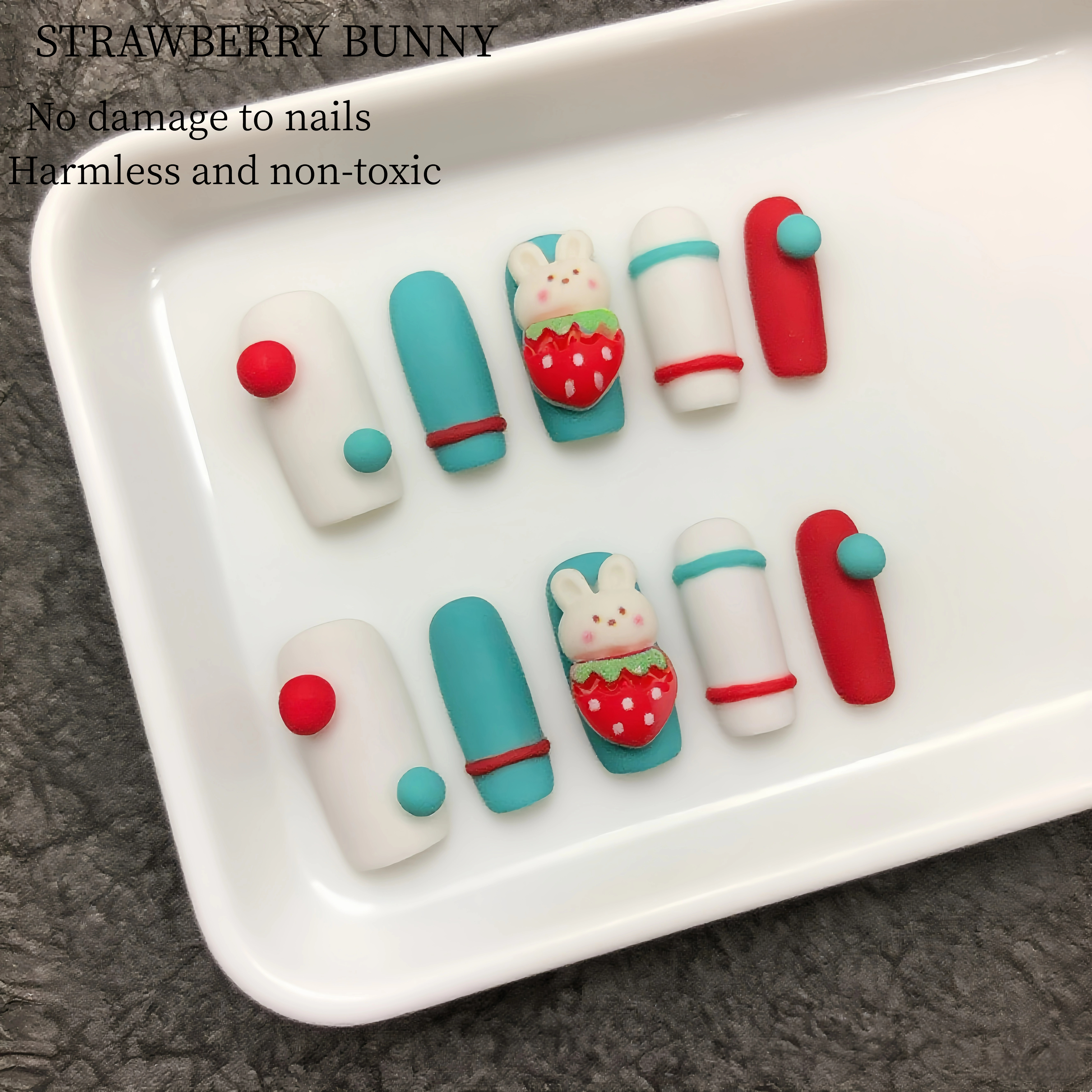 DetailThese nails are a delightful expression of playfulness and cuteness. The combination of white, teal, and red creates a vibrant and eye - catching color palette. The adorable bunny sitting on a strawberry, along with the simple round accents, adds a touch of whimsy. It's a perfect nail design for those who want to showcase their fun - loving personality, whether it's for a casual day out or a themed party. These nails are sure to bring smiles and spread a cheerful vibe.