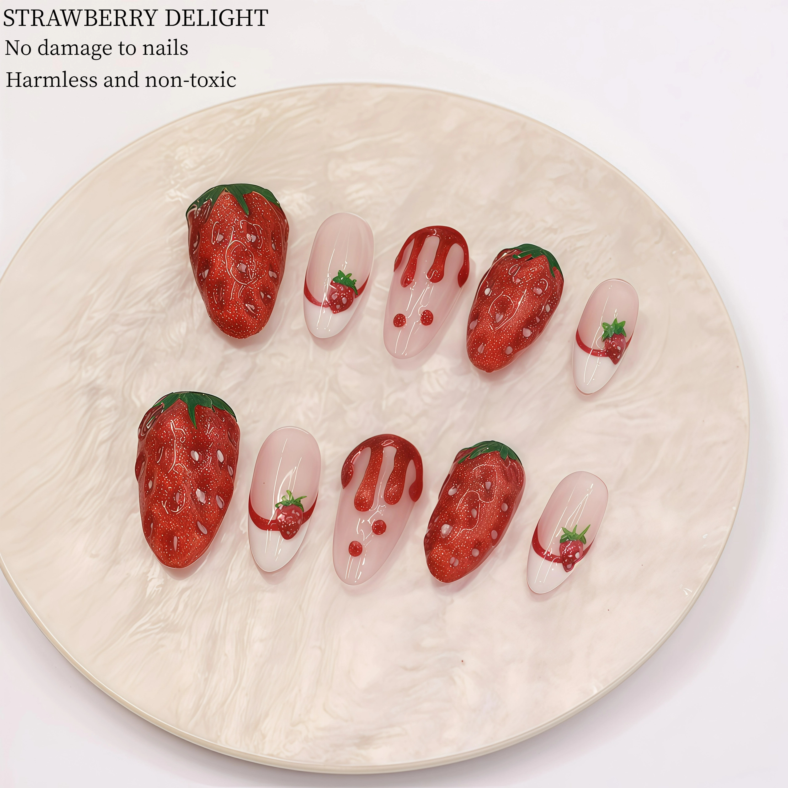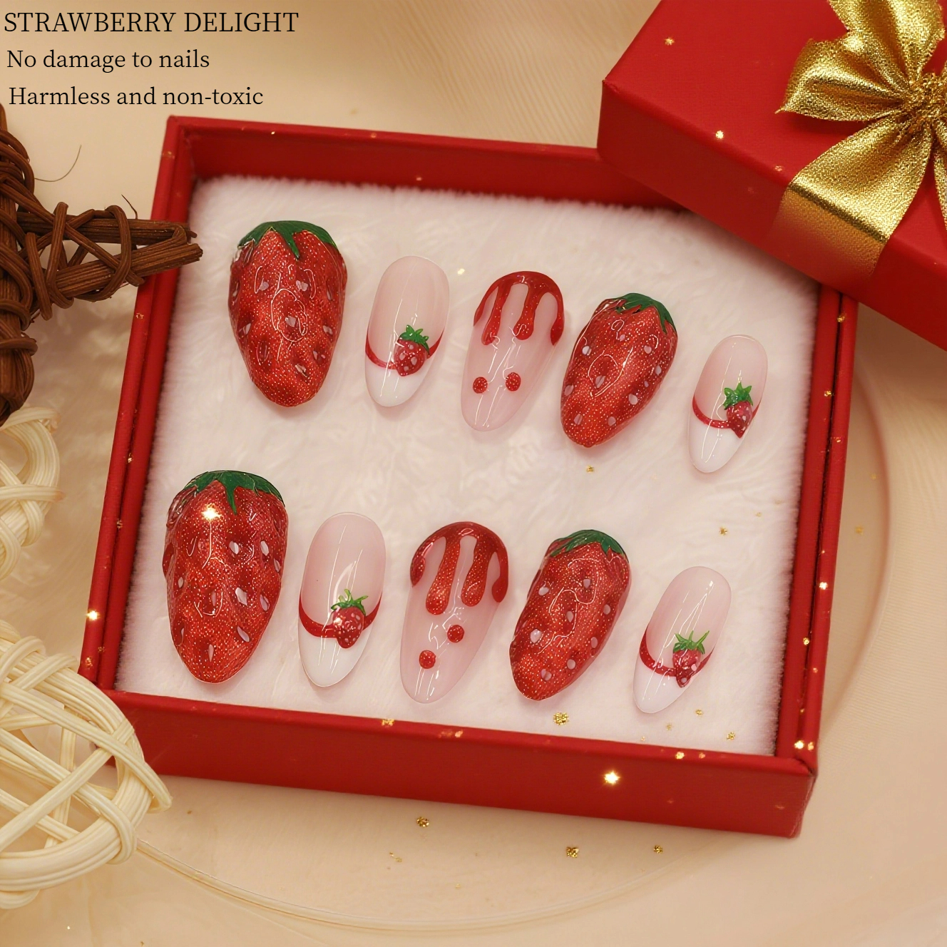 These strawberry - themed nails are an absolute treat for the eyes. The vivid red of the strawberries contrasts beautifully with the soft, light - colored base. Some nails are crafted to look like actual strawberries, while others feature delicate strawberry - inspired patterns. Whether you're a fruit lover or just looking for a fun, vibrant nail design, these nails are sure to make a statement and add a splash of fruity freshness to your look.